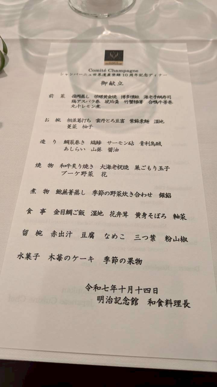 2025年10月14日(火)に「シャンパーニュのコトー、メゾン、カーヴ」のUNESCO世界遺産登録10周年を記念し、明治記念館にてメディアディナーが開催されました。