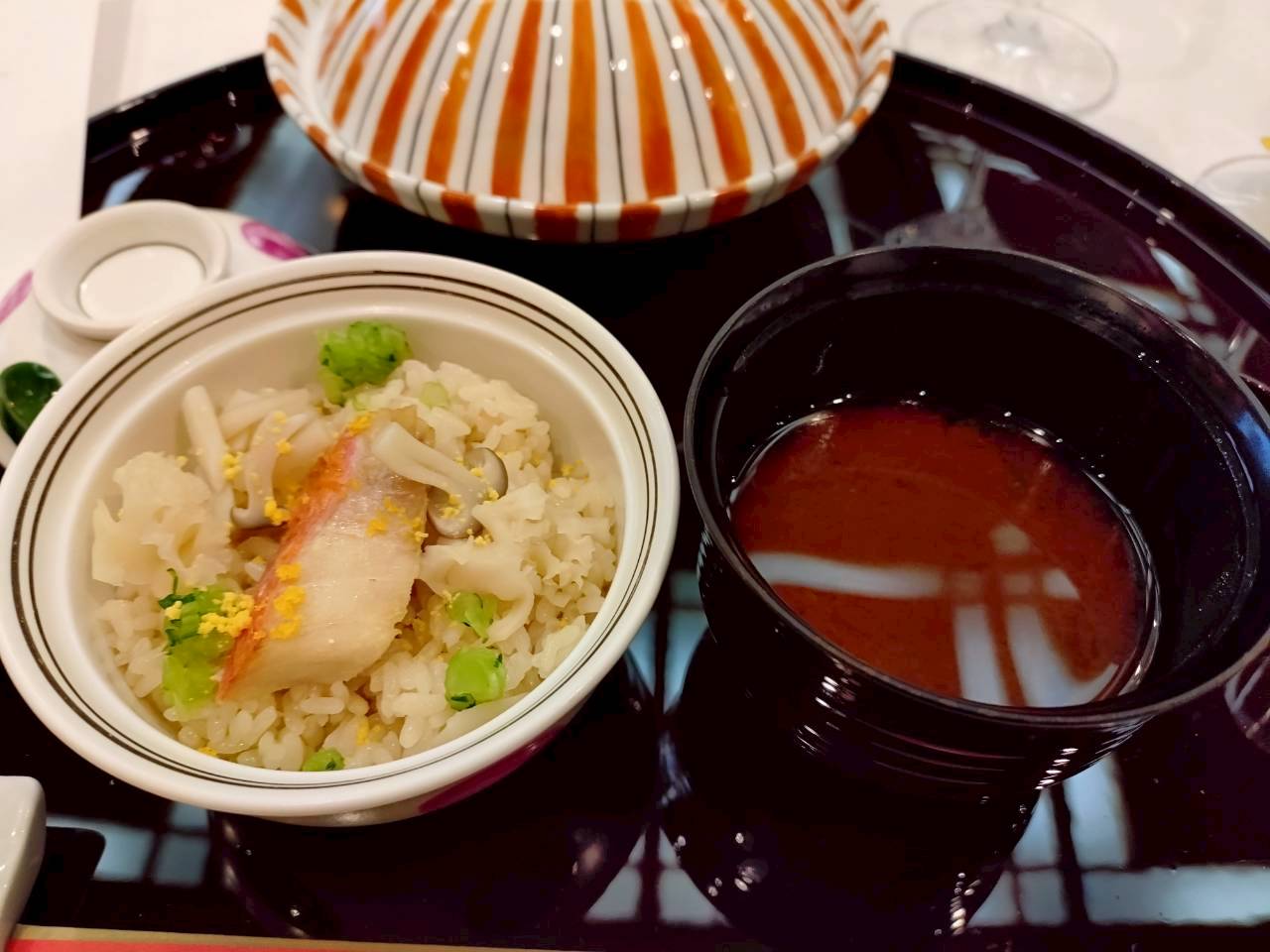 Kinmedai (golden eye snapper) rice, Shimeji mushrooms, Hanabiratake