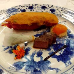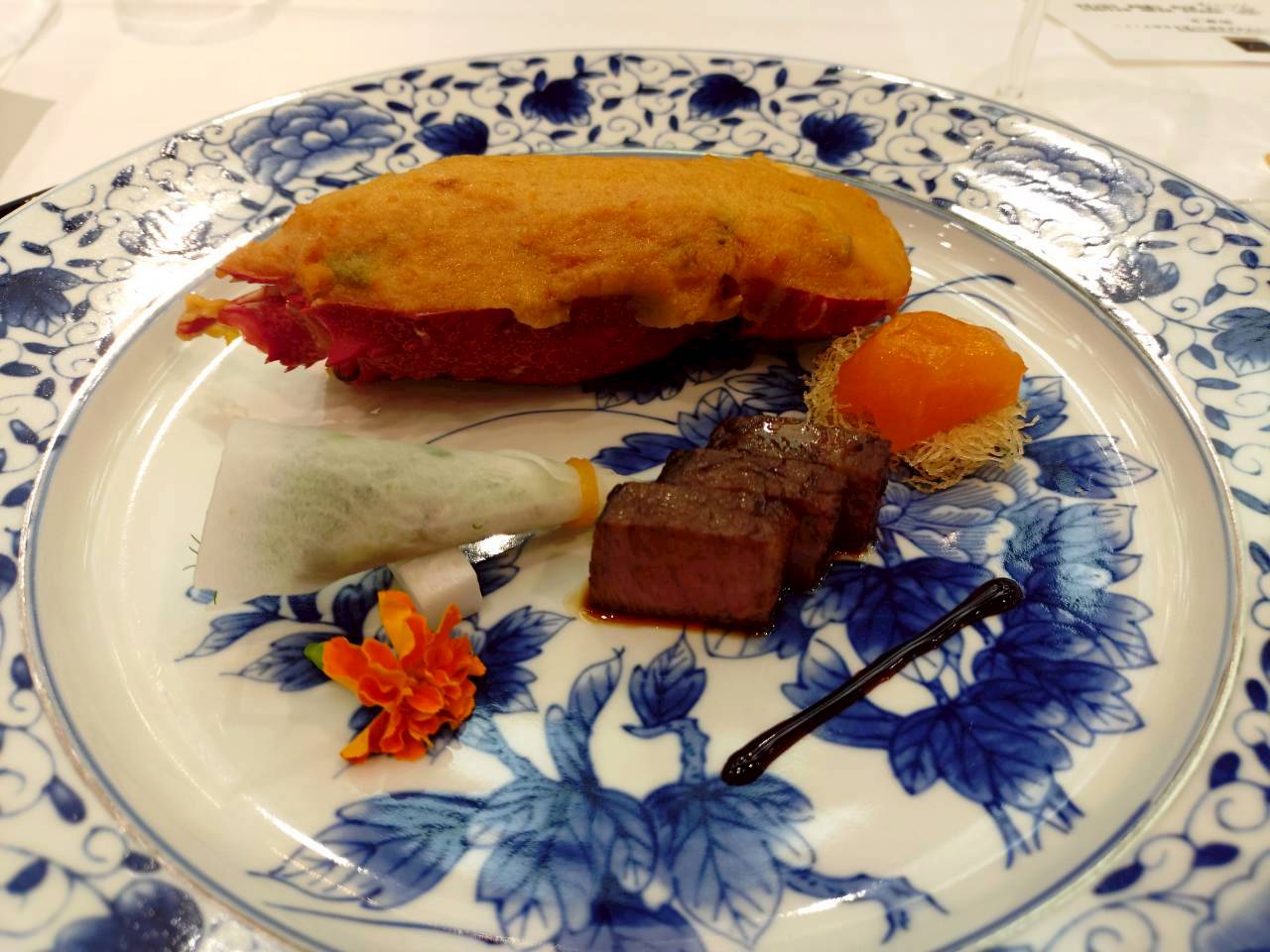 Seared wagyu beef, Festive grilled king prawn, Nest-style egg, Bouquet vegetables, Edible flower