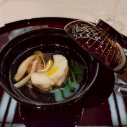 Mineoka-style steamed dish, Turban shell (sazae) grilled with golden miso, Hakata-style smoked salmon, Shrimp tazuna sushi (braided style), Chicken and asparagus roll, Amber jelly (kohaku-kan), Snow crab dumpling (kani shinjo), Roasted duck and burdock roll, Simmered sweet potato with lemon flavor