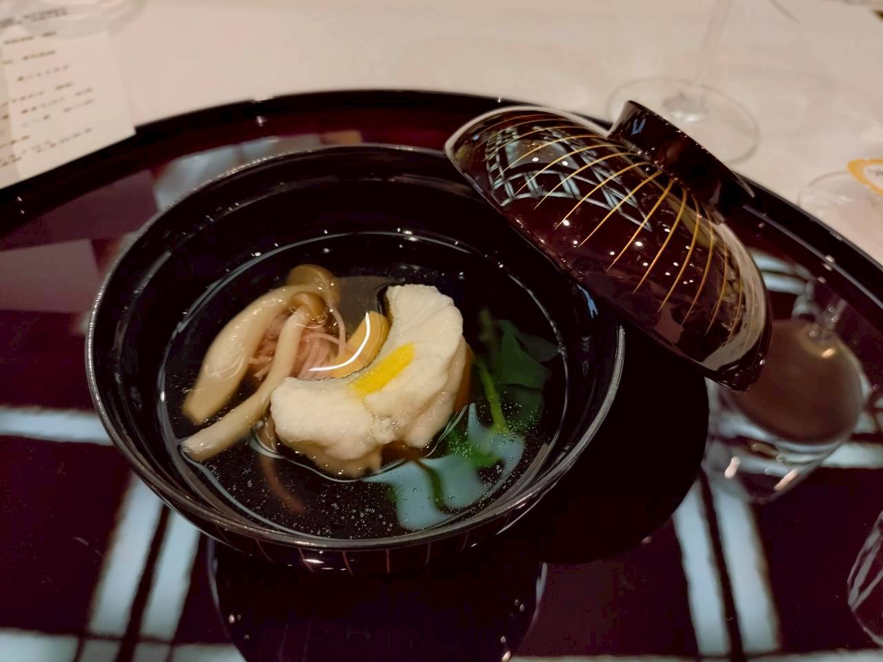 Ainame (greenling) coated with kudzu starch, Sea urchin tofu, Shiso flavored somen noodles, Shimeji mushroom, Tsuru-na greens, Yuzu