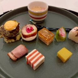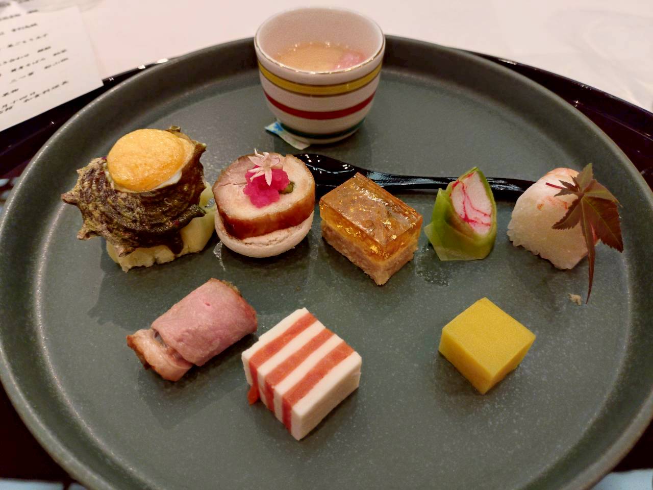 前菜 嶺岡蒸し 栄螺黄金焼 博多燻鮭 海老手綱寿司 鶏アスパラ巻 琥珀羹 竹蟹糝薯 合鴨牛蒡巻 丸十レモン煮
